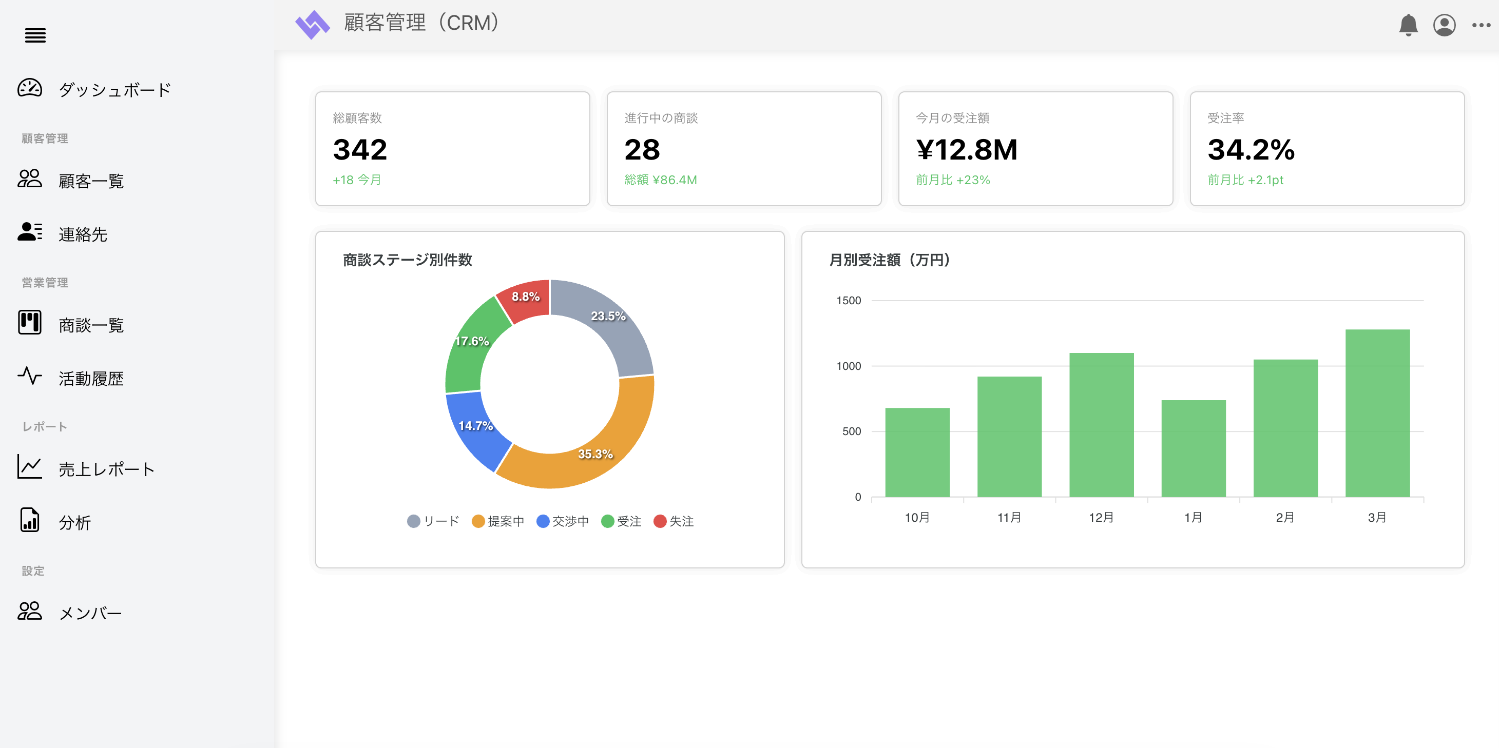 顧客情報・商談・活動履歴を一元管理。営業パイプラインを可視化し、受注率の向上を支援します。