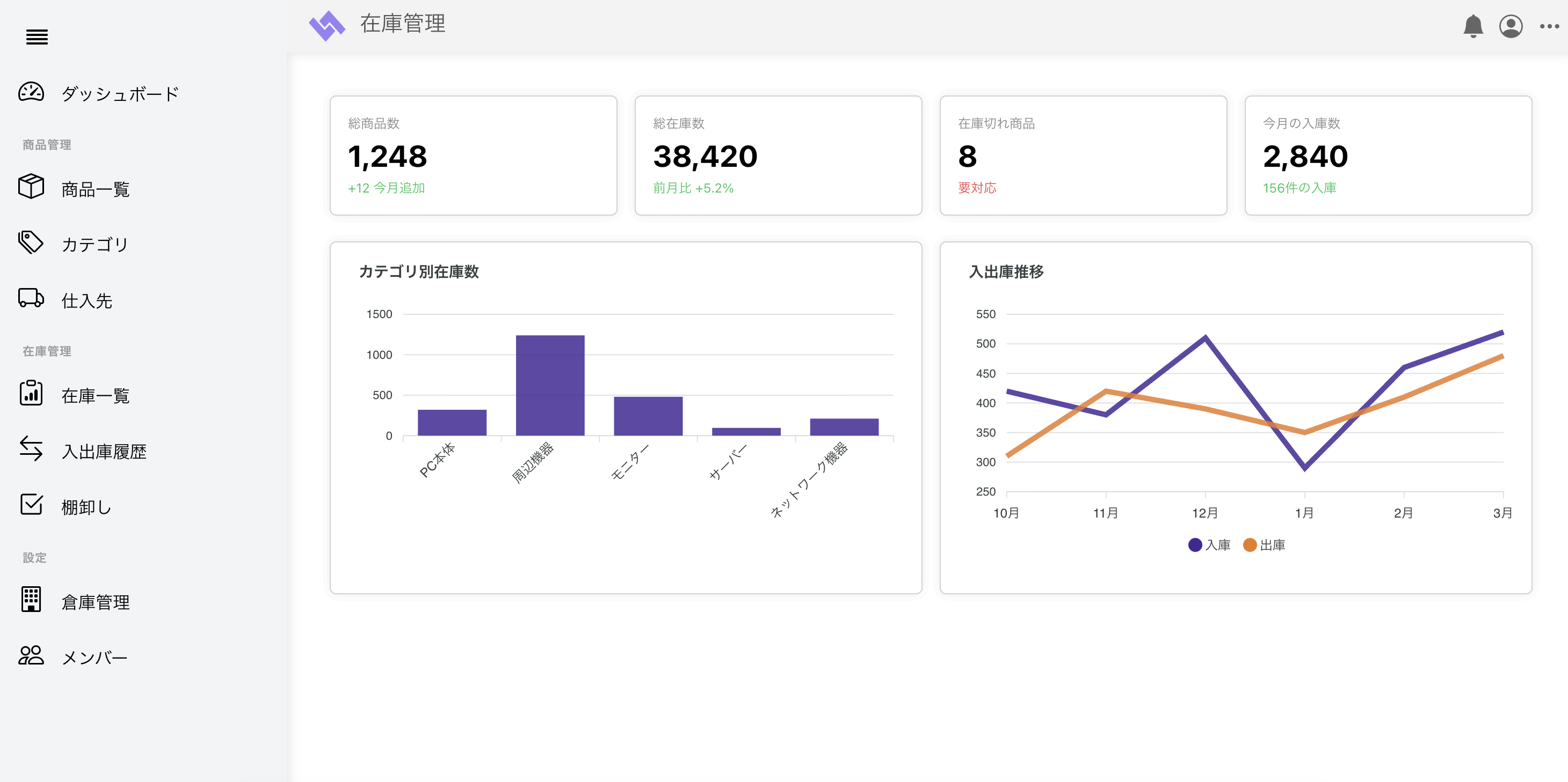 商品・倉庫・入出庫をリアルタイムに管理。在庫の見える化を実現します。