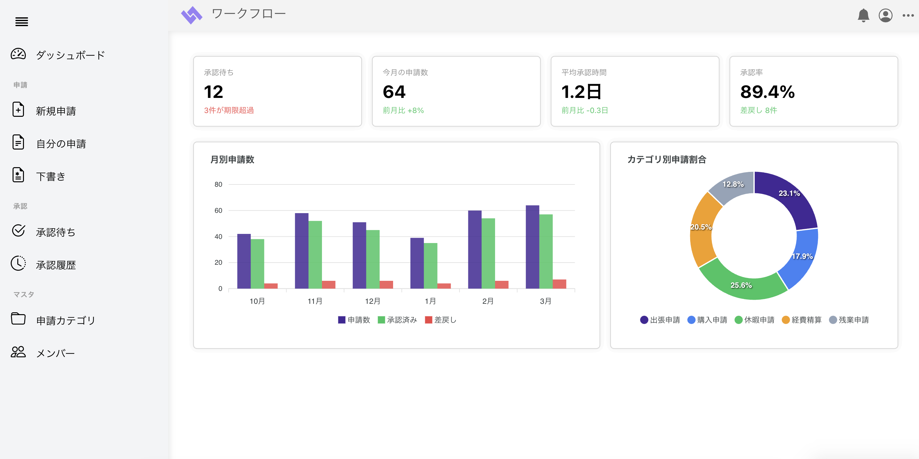 各種申請・承認フローをデジタル化。承認状況をリアルタイムに把握し、業務のスピードを上げます。
